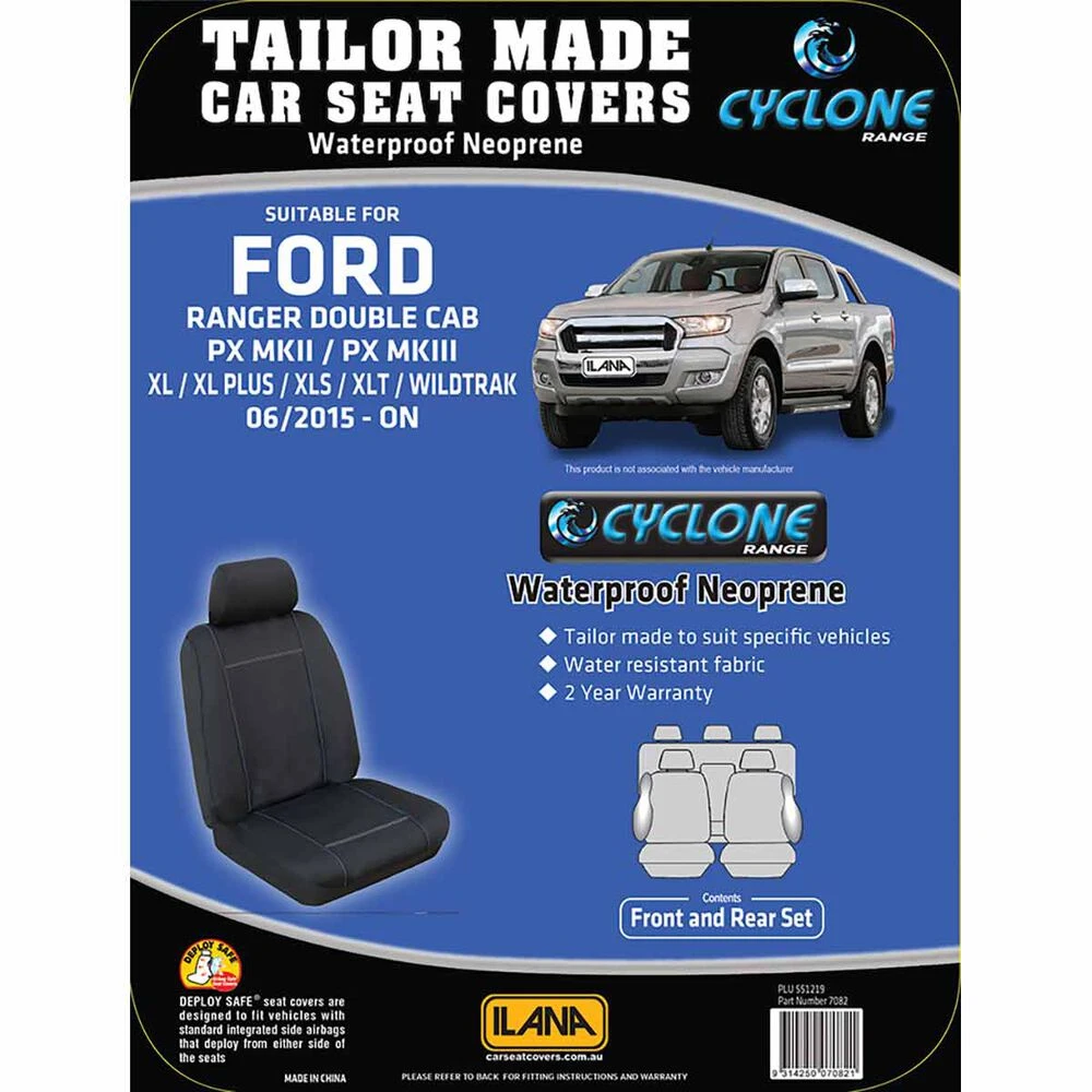 - A two row set of tailor made front and rear seat covers to suit Ford Ranger PX MKII Dual Cab 06/2015 onwards