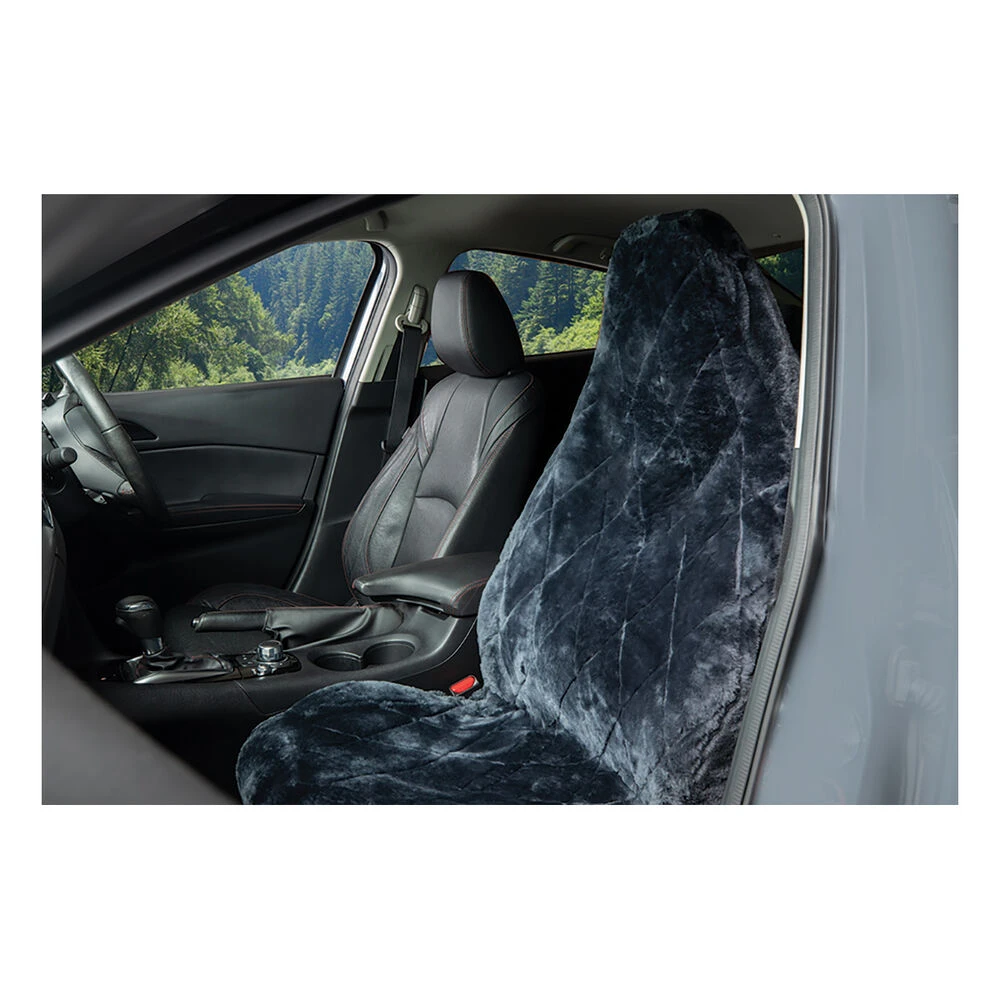 Sheepskin car seat covers are a fantastic addition to any vehicle, holding in warmth during winter and allowing air flow during summer. This SCA Sheepskin Seat Cover is designed to be a universal fit for single front bucket seats with adjustable or built-in head rests with or without side airbags. Manufactured from charcoal coloured patchwork sheepskin on the front side of the covers, and finished with matching acrylic fur around the skirt and back side.