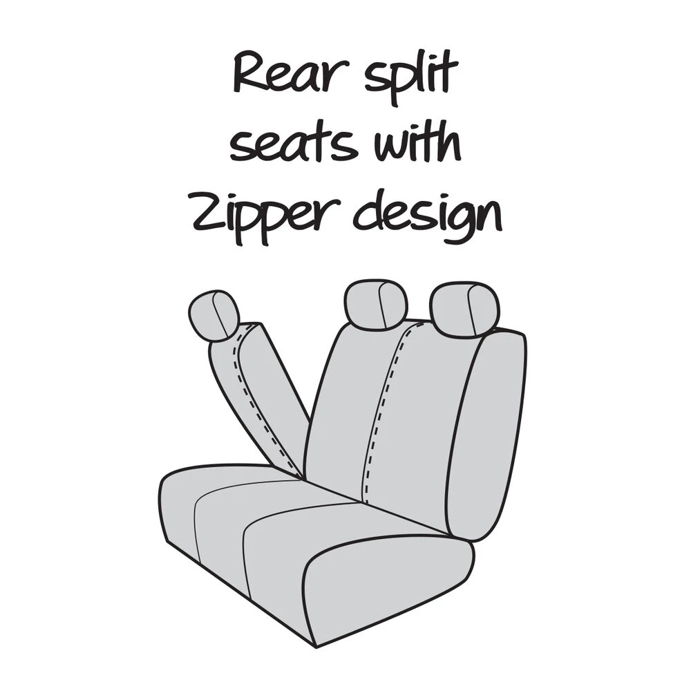 This particular set is designed for a rear 3-person bench seat with adjustable head rests and no fold down arm rest. The unique zipper design however allows for installation on both 40/60 and 60/40 split seats, enabling the folding of one side of the rear seats while installed.